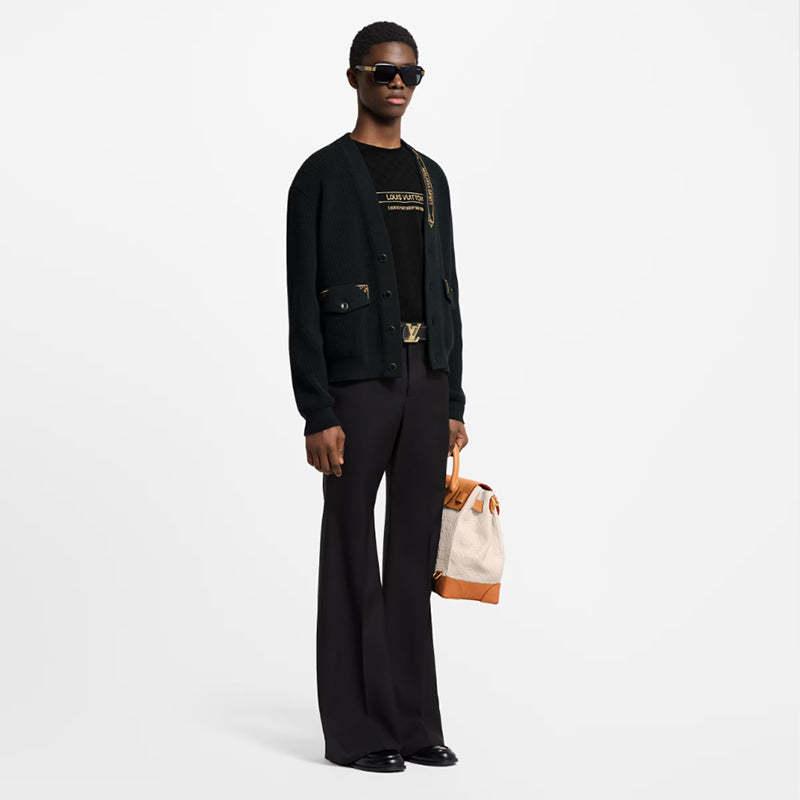 • 洗練されたゴールドカラーの刺繍を施したエレガントなブラックのカーディガン。左の襟元には「Louis Vuitton」シグネチャーを、フラップポケットにはモノグラム・フラワーのディテールをさりげなくあしらいました。コットン混紡素材のリブニットは軽やかで通気性に優れ、より暖かな日にぴったり。本コレクションのテーマであるクルーズ船のイブニングシーンにおいて、トラディショナルなジャケットに代わりシックでありながらもリラックスした装いを演出する1着です。