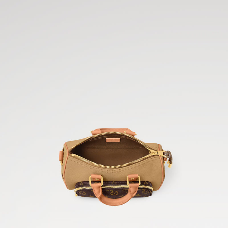 このキーポル バンドリエール 25 ハンドバッグは、スエードのディテールとアンティーク調の金具が特徴のグレインレザーで作られています。コード ジッパー プルが付いたモノグラム キャンバスの外側ポケットが開くので、持ち物を簡単に取り出すことができます。取り外し可能で調節可能なレザーショルダーストラップにより、快適な肩掛け体験が得られます。