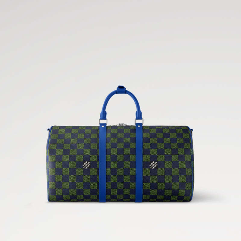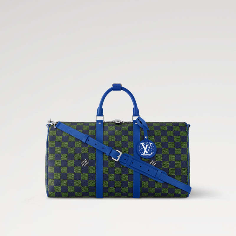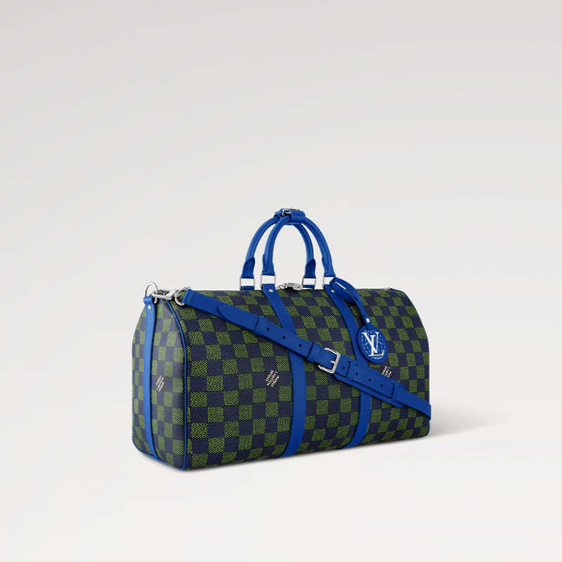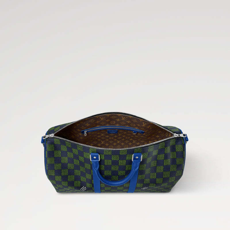 • ファレル・ウィリアムズがデザインしたキーポル バンドリエール 50は、ダミエ・ヘリテージ・コーテッドキャンバスを使用。チェッカーボード模様に、アイコニックな「Marque Louis Vuitton Déposé」の文字がアクセントを添えています。カーフスキンレザーのトリム、トップハンドル、取り外し可能なショルダーストラップがバッグ全体を彩り、内側にはモノグラム・キャンバスのライニングが施され、ブランドの伝統へのオマージュを表現。