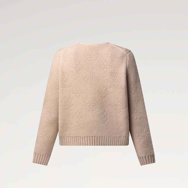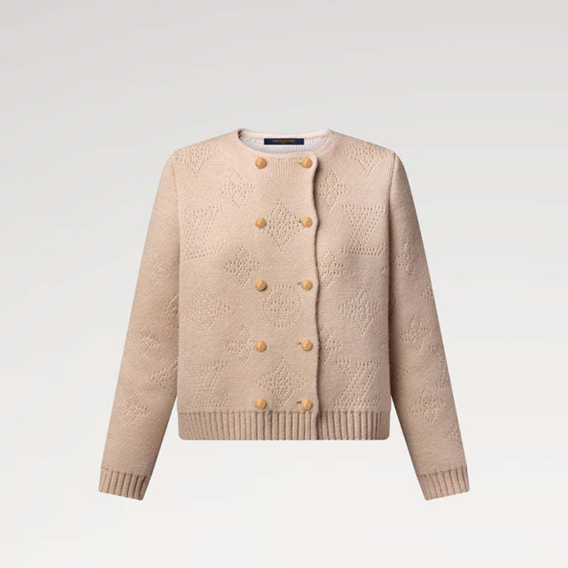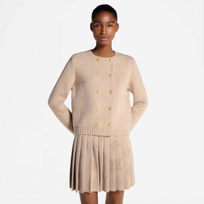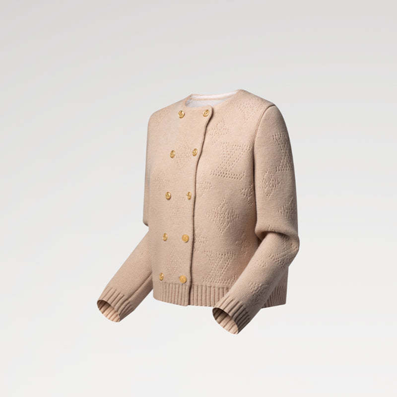 柔らかなカシミヤニットを使用したカーディガン。大きなモノグラムのパーフォレーテッドパターンが洗練された印象を与えます。ダブルブレストのフロントにはLVリースボタンがあしらわれ、袖口と裾はワイドリブ仕様でモダンなスタイルを完成させています。