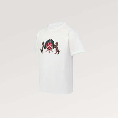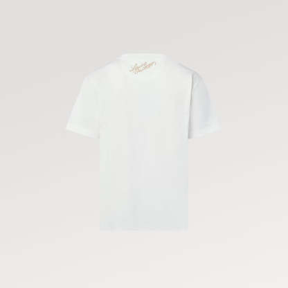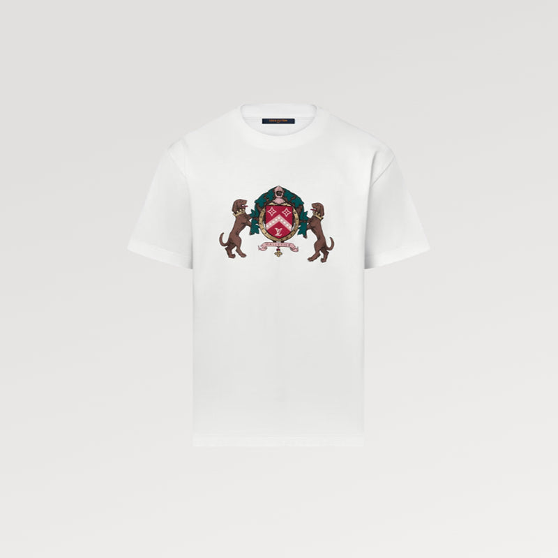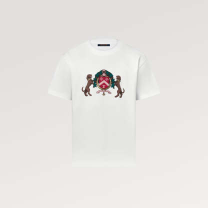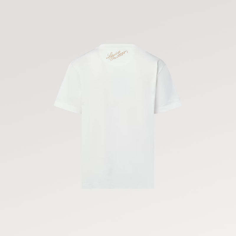 • オーガニックコットンで仕上げた柔らかいホワイトTシャツ。今コレクションならではのウエストミンスターの由緒正しい犬を連れた飼い主の姿から着想を得たLV ドッグの紋章を胸元にプリントして、普段使いの1着をアップデートしました。遊び心溢れる、ゴールドカラーの刺繍とレジンパールで描いた紋章風の犬がアクセントをプラス。ゴールドカラーの糸で刺繍した手描き風の「Louis Vuitton」シグネチャーが背面に彩りを添えます。