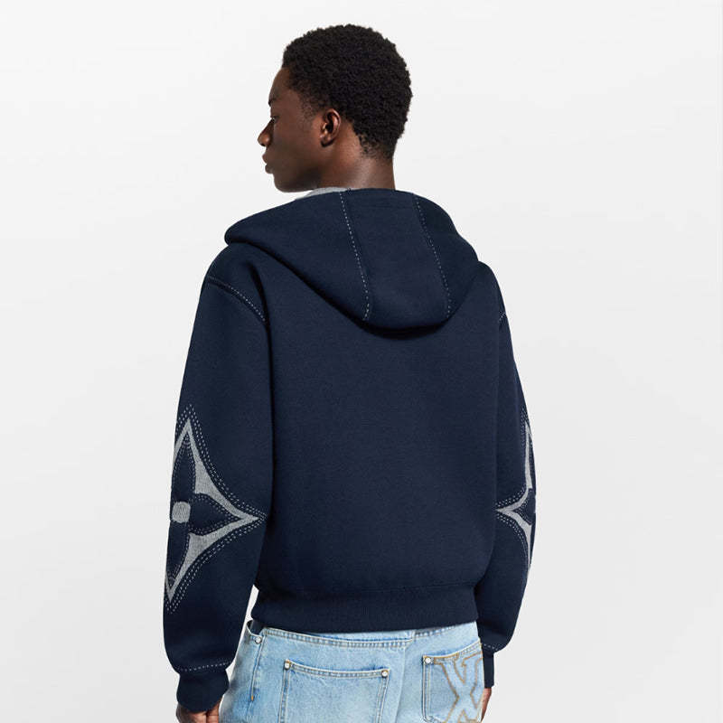 洗練されたインターシャニットが際立つ、ブルーのファスナー付きコットンフーディ。ドット状のラインがトップステッチや刺繍のような錯覚を生み出します。胸元にはコントラストを効かせた「LV」を、両肘にはグラフィカルな存在感を放つ大ぶりのモノグラム・フラワーをあしらいました。軽やかなアウターとしても活躍する、カジュアルでありながら上品な1着。