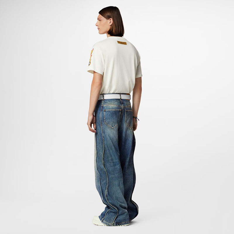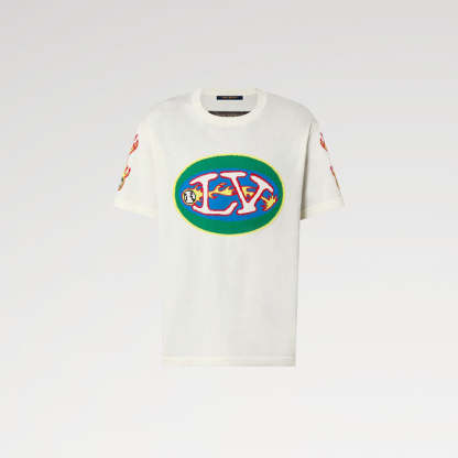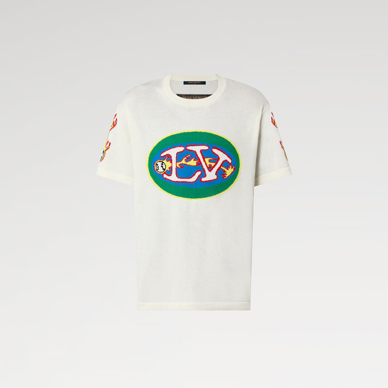 このTシャツは、胸にインターシャのLVロゴを配置し、ボールテールの炎のパターンが袖まで続きます。柔らかいコットンは鮮やかな色で染められており、背面にはリバースエフェクトのシルクラベルが付いています。
