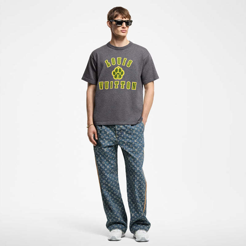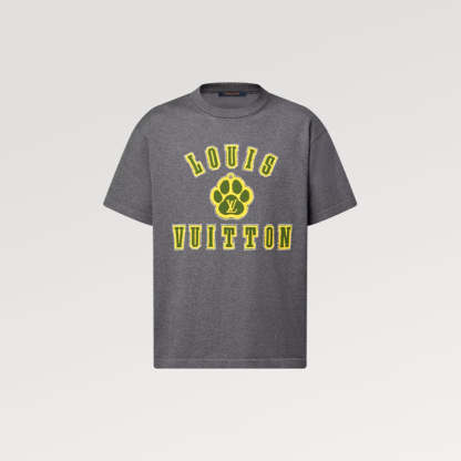 オーガニックコットンを使用したプレッピーなショートスリーブのクルーネック。紋章風の肉球のデザインを遊び心いっぱいに織り上げ、胸元と背面にはカレッジ風の「Louis Vuitton」シグネチャーとLVの文字をあしらいました。グリーン & イエローを基調とした大胆なモチーフのアウトラインに、繊細なビーズを散りばめて洗練されたひねりを加えたグラフィカルな1着です。