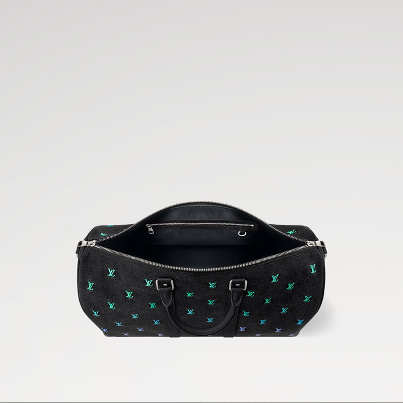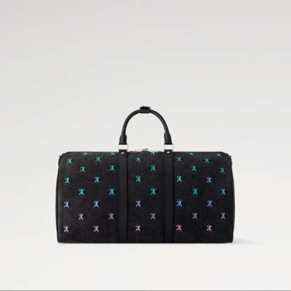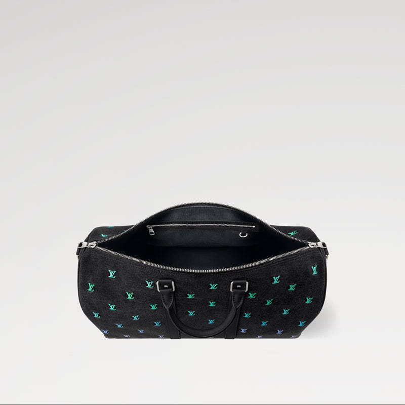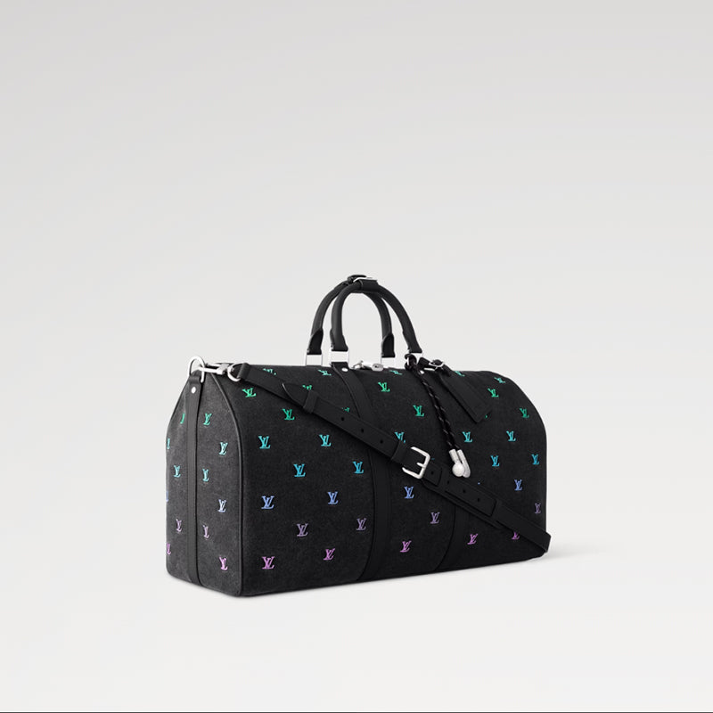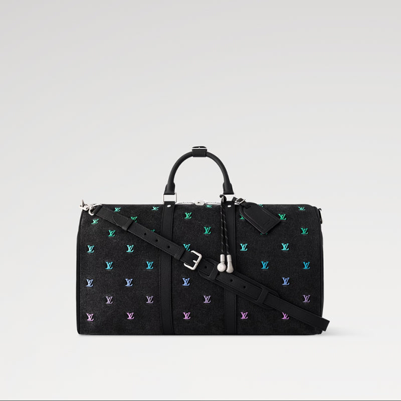 LV ブラゾン・デニムでスタイリッシュに仕上げた「キーポル・バンドリエール 50」。ファレル・ウィリアムスの共感覚──脳が複数の無関係な感覚を通じて知覚情報を伝達する現象から着想を得て、彼が耳にした音楽を鮮やかな色合いで表現しています。ブラックのウォッシュデニムにカラフルなLV イニシャルの刺繍を施し、定番のトラベルバッグに洗練されたタッチを添えました。
