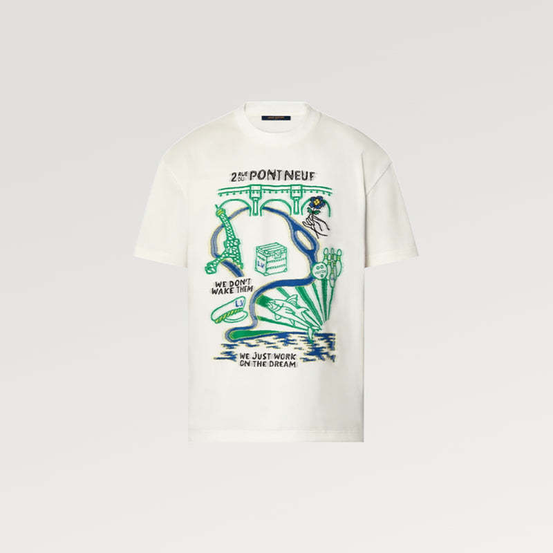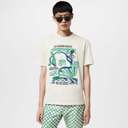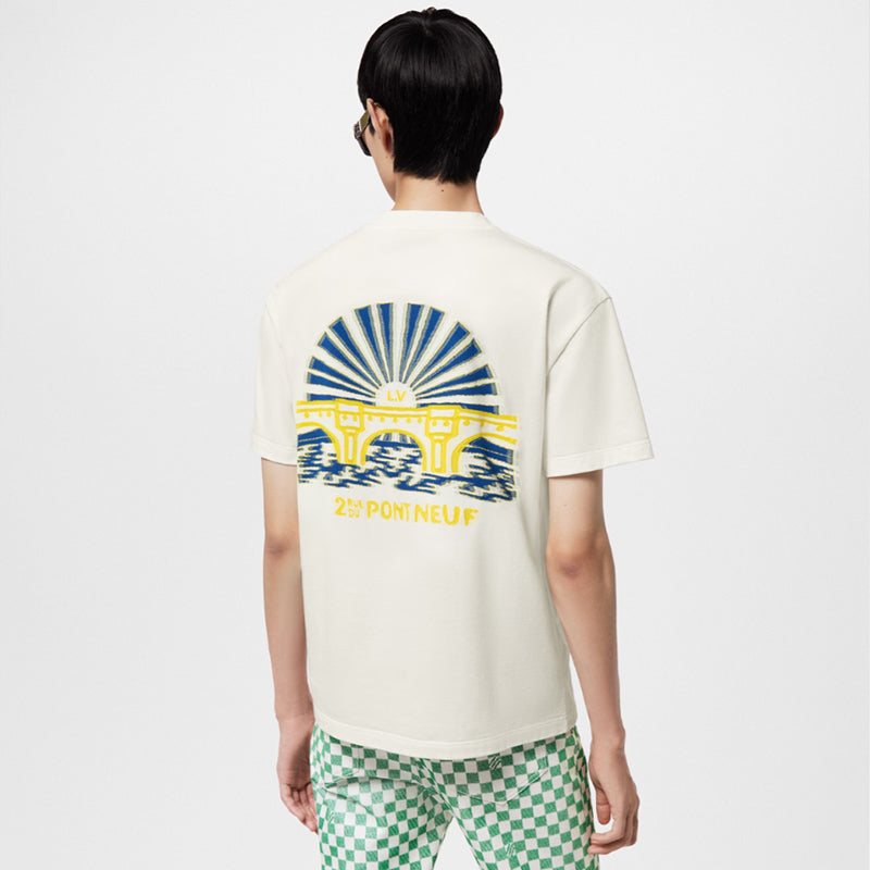 2024年春夏ランウェイから登場したこのインターシアTシャツは、LVポンヌフのモチーフと、メゾンのロゴや参照を散りばめたパリ風のグラフィックで、芸術的な雰囲気を醸し出しています。フロントとバックの編み目がブランドの精巧な職人技をさらに証明しています。