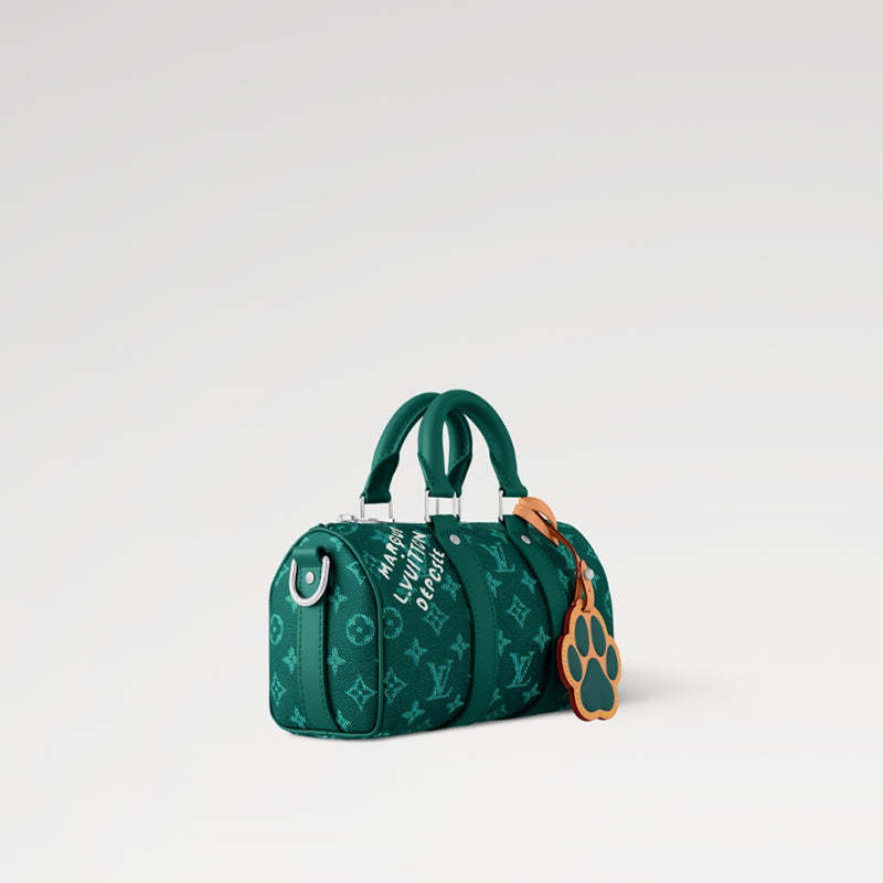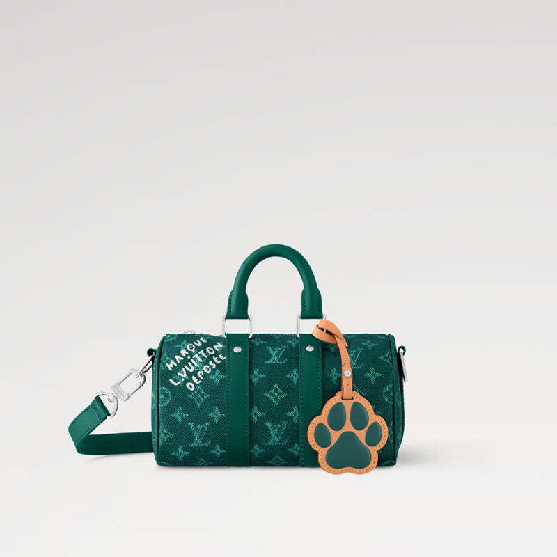キーポル バンドリエール 25 バッグは、モノグラム ヘリテージ キャンバスとレザーのトリムで作られており、ファレル ウィリアムスはオリジナルのダミエ キャンバスから Marque L.Vuitton Déposée のロゴを移植しました。 LVイニシャルがエンボス加工された、犬の足の形をしたパッド入りバッグ。