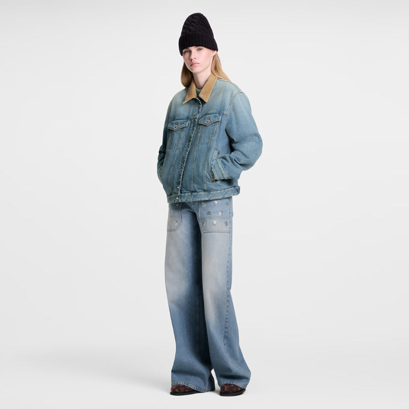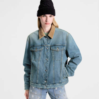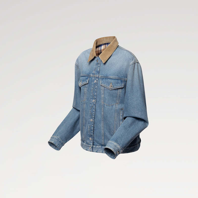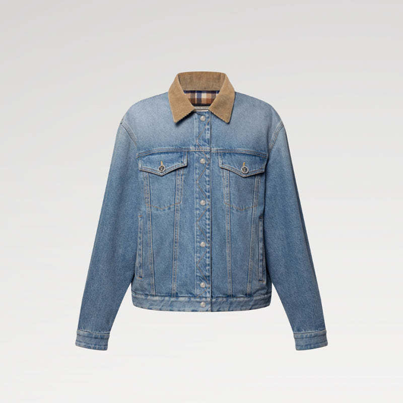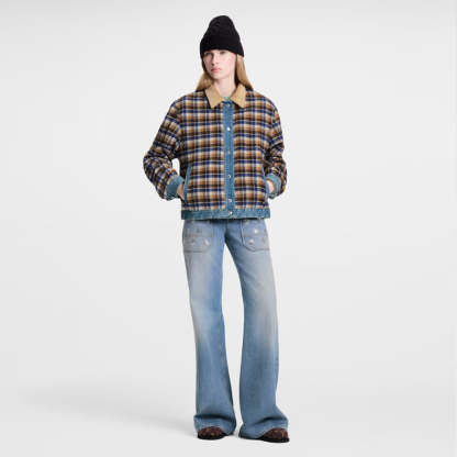 このリバーシブルジャケットは、片面はクラシックなデニム生地を使用し、印象的なステッチと、胸ポケットのパンチング加工されたLVサークルボタンをはじめとする輝くメタル金具がアクセントになっています。裏面は今シーズンのチェック柄コットン素材を使用し、マウンテンモチーフをあしらったLouis Vuittonトラベルタグがフロントとのコントラストを演出しています。コーデュロイの襟がスタイルを完成させます。