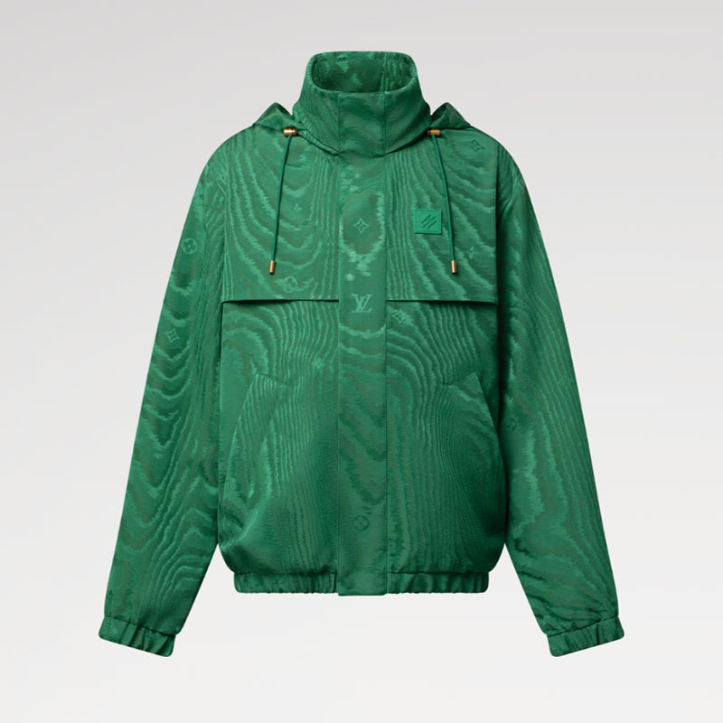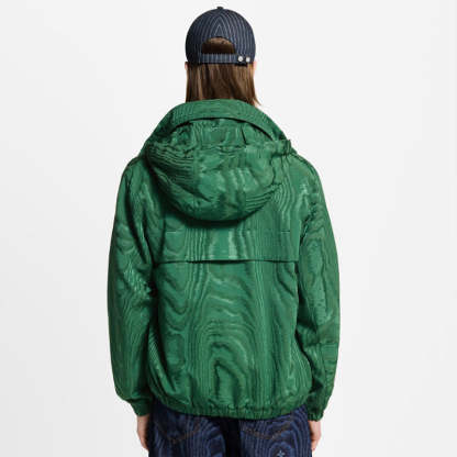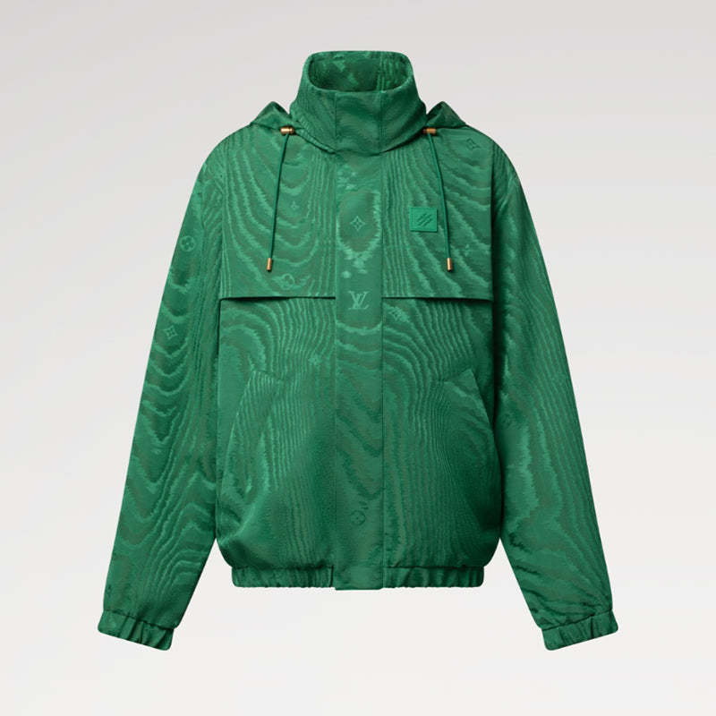 この防風ジャケットは、今シーズンのLVモアレパターンをジャカード織りで表現し、モノグラムの要素と共にブランドのシグネチャースタイルを表現しています。胸元には「Marque L.Vuitton Déposée」のラバーパッチ、襟に収納できる調節可能なフードがスポーティな雰囲気を添えています。