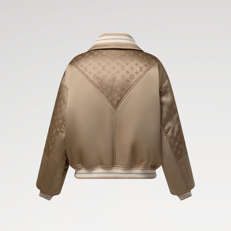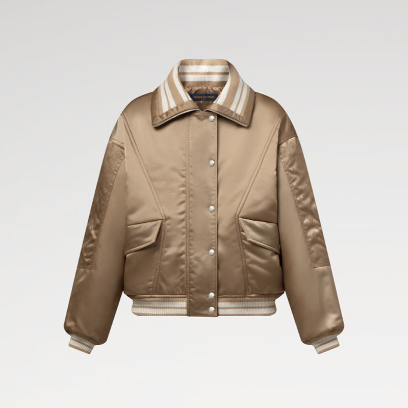 パディングで保温性を高めた、スポーティで着心地のよい定番ボンバージャケット。今シーズンらしいシックな色合いの光沢感のあるナイロンサテンにモノグラムのアクセントをさりげなく添え、襟やカフス、ウエストバンドを際立たせる同系色のストライプのリブ編みをあしらいました。敢えて目立たせたシームのディテールと大きなフラップポケットが構築的なムードを演出し、デザインを完成させます。