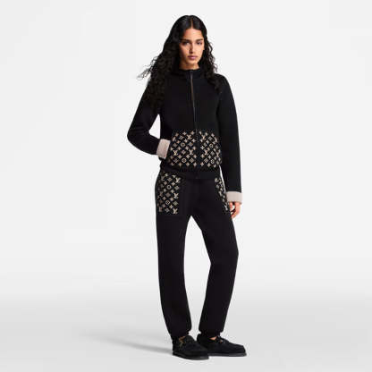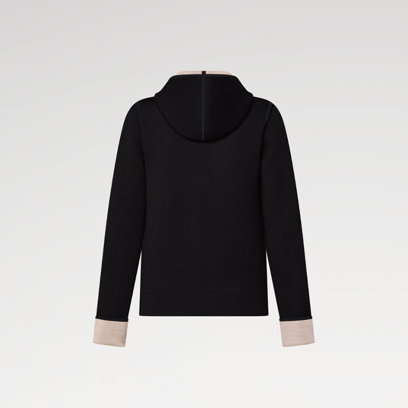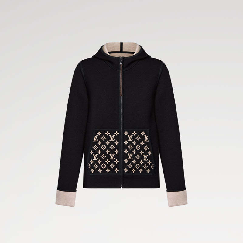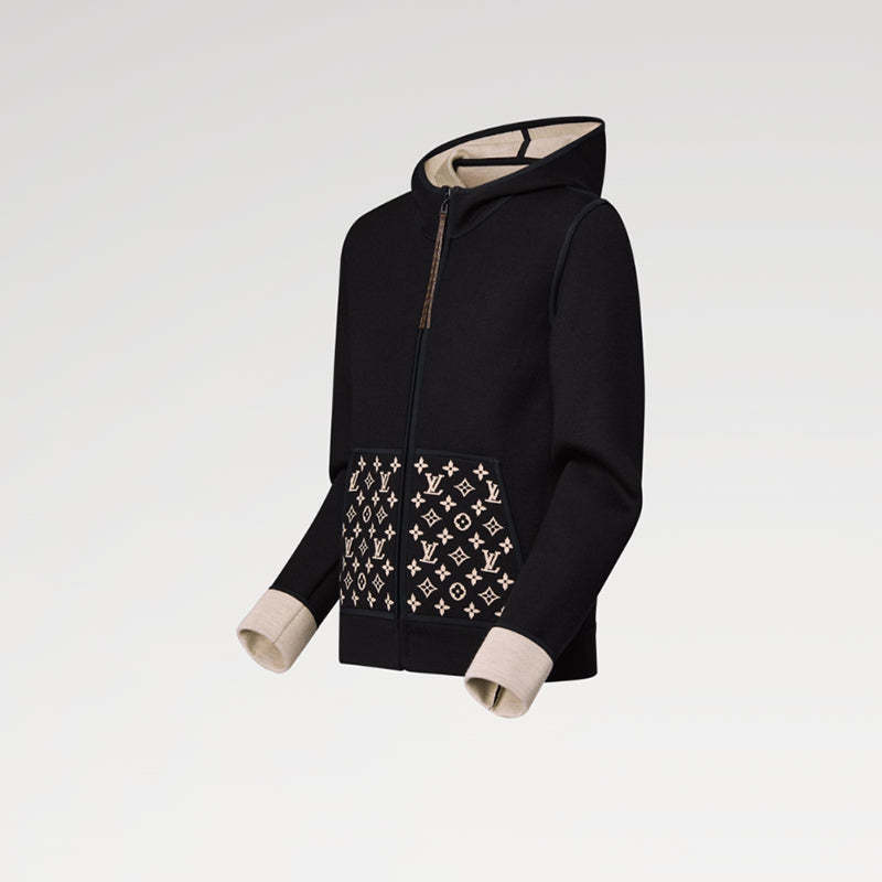 今シーズンを象徴するグラフィカルなコードで、モダン&スポーティな印象にアップデートしたフーディ。着心地のよいウールの混紡ニットに施した、コントラストカラーのライニングが袖口から覗きます。フロントポケットにはツートーンカラーのモノグラム・モチーフがあしらわれ、フロントファスナーに配したモノグラム・キャンバスのフリンジ付き引き手がメゾンならではのタッチをプラス。