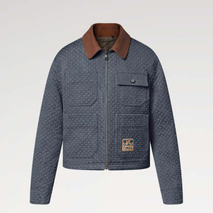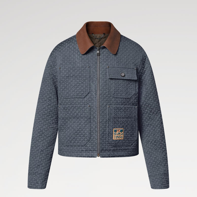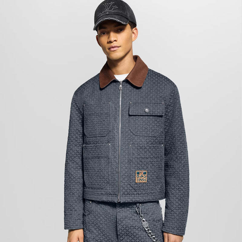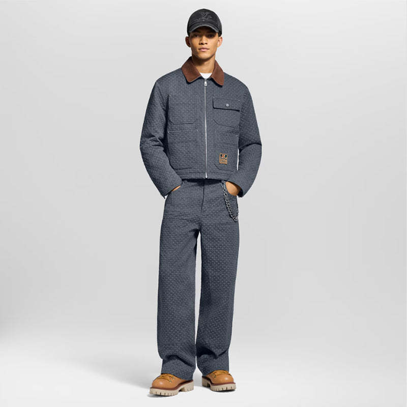 ダークグレーのオーガニックコットンを使用したワークウェアジャケット。2025秋冬ファッションショーに登場した、質感豊かなジャカード織りのダンディ・モノグラム モチーフをあしらいました。ブラウンレザーのコーデュロイ風カラーを配し、4つのリベット付きパッチポケットの1つを「Marque L. Vuitton Déposée」のレザーパッチが彩ります。内側に軽く施したキルティングにより季節を問わず活躍する1着。揃いのパンツと合わせれば、カジュアルながらも個性的なセットアップが楽しめます。