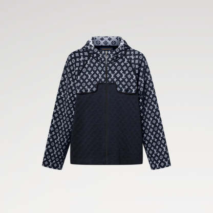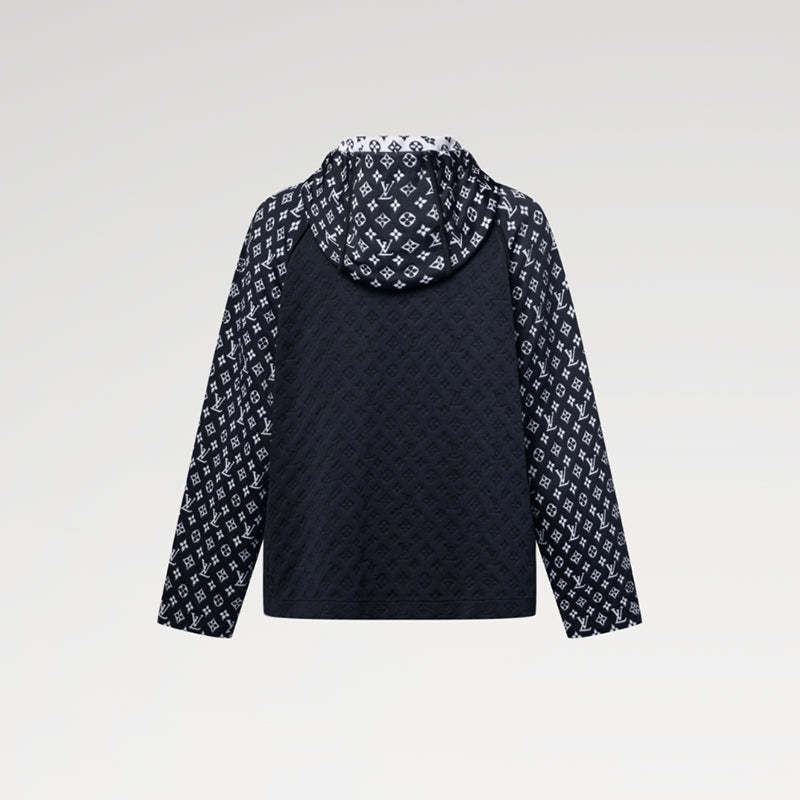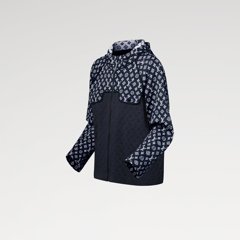 モノグラム・ジャカード パターンを全面に施した、温かみのあるニット素材のフーディ。コントラストを効かせたグラフィカルなツートーンカラーのシグネチャーをフードや袖、胸元に配し、ボディ部分にさりげない変化をつけています。2つの控えめな胸ポケットをはじめとする構造をブラックのパイピングで際立たせ、務歯見せファスナーでスポーティなスタイルに。