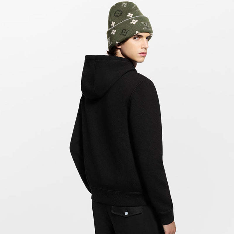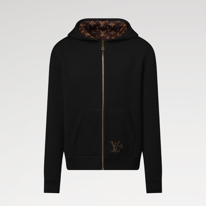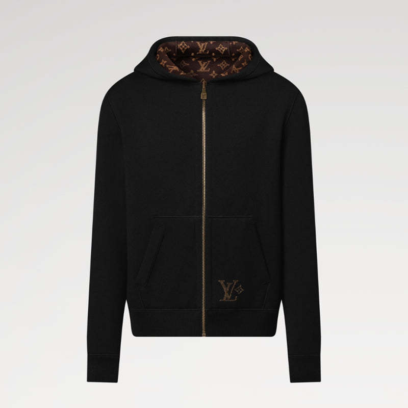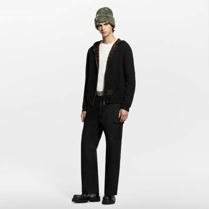 リバーシブルのフード付きブルゾン。温かみのあるコットン&ウールを混紡したダブルフェイスのニットで仕立てました。タイムレスなブラックの面には、ポケットの1つにコントラストカラーのインターシの「LV」があしらわれ、裏面には深みのあるブラウンの色合いで表現されたジャカード織りのモノグラム・モチーフがグラフィカルなアクセントを添えます。ジャケットの下にはもちろん、暖かい日にはアウターとしても楽しめる多用途な一着。