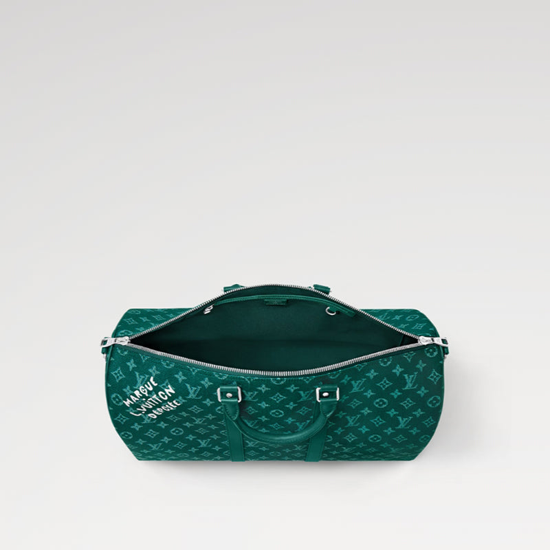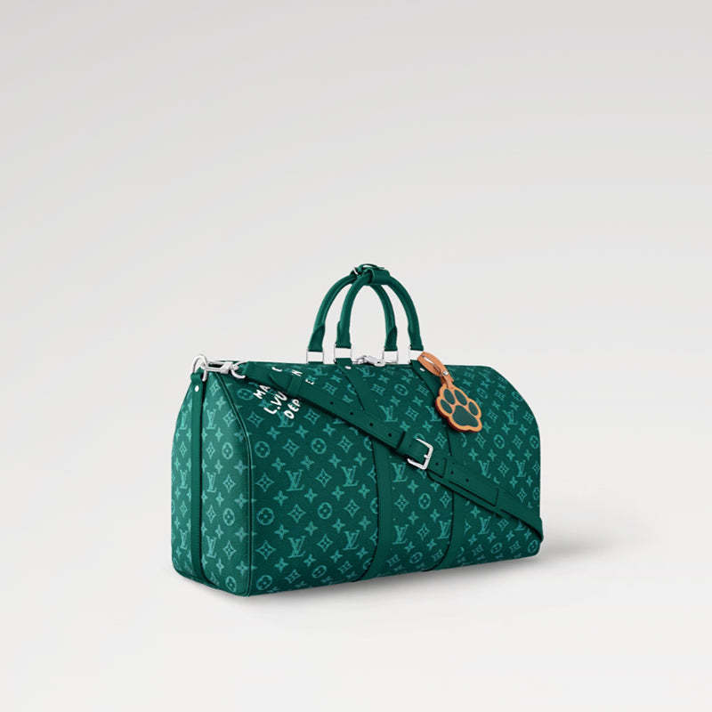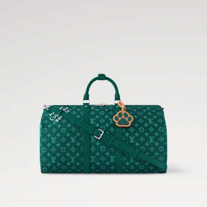 ファレル・ウィリアムスが手掛けたキーポル バンドリエール 50 ダッフルバッグは、モノグラム・ヘリテージ キャンバスを使用し、ルイ・ヴィトン・デポゼなどのダミエ・キャンバスのクラシックな要素を取り入れています。トップハンドルには、LVモノグラムがエンボス加工されたパッド入りの犬の足型チャームが付いています。