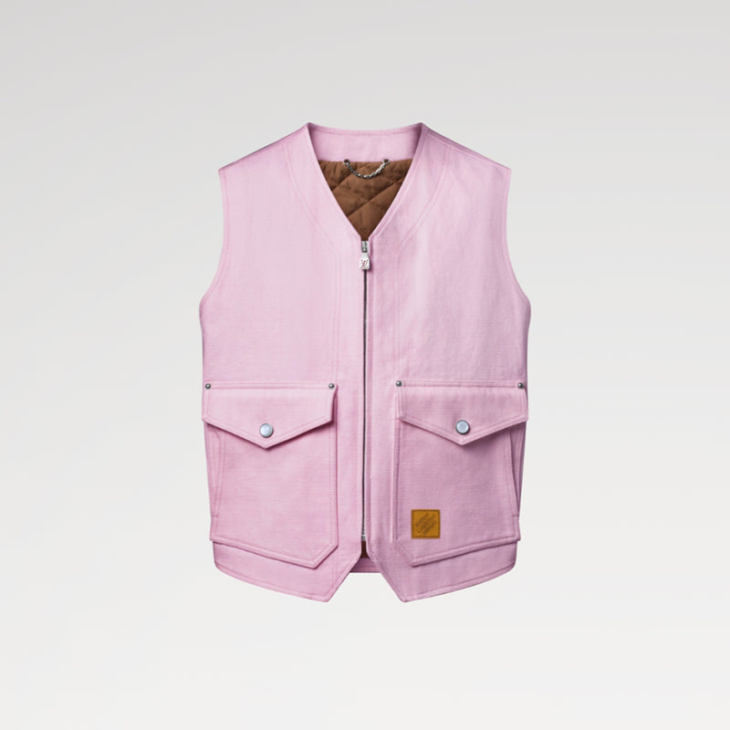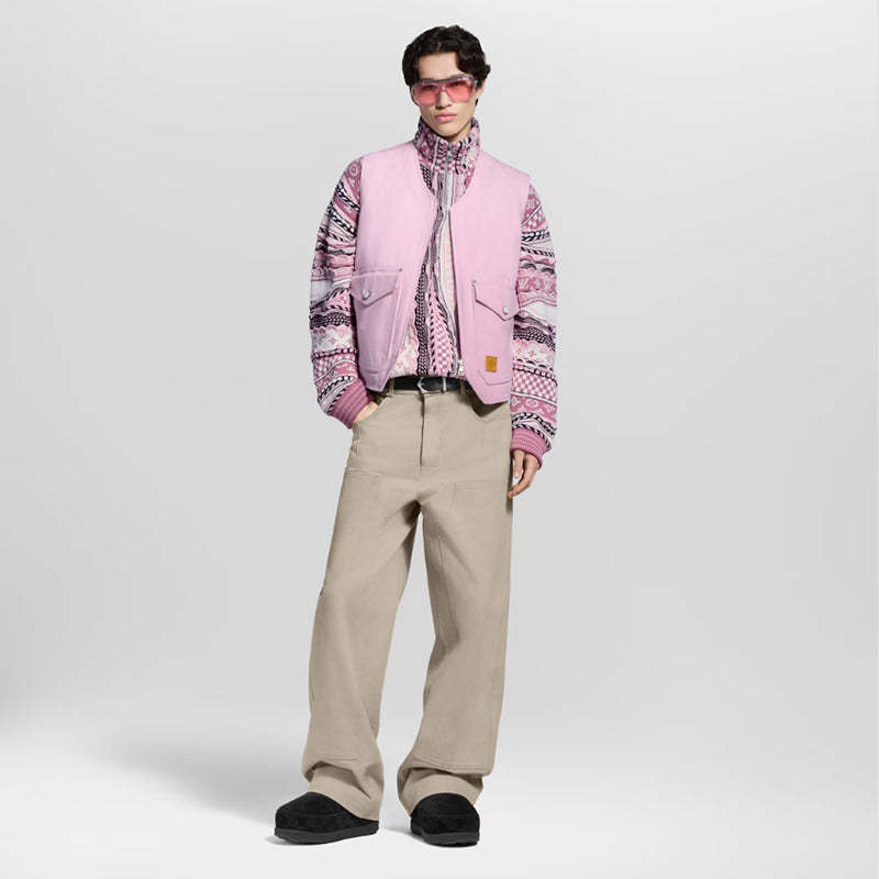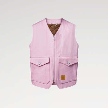 このジップアップワークウェアベストは、桜色のコットンキャンバス地で仕立てられ、ファレル・ウィリアムスとNIGO®が2025年秋冬コレクションのファッションショーで取り入れたアメリカと日本の文化要素へのオマージュです。フロントポケットにはパール調のスナップボタンがアクセントを添え、そのうちの1つにはMarque L.Vuitton Déposéeレザータグが付いています。キルティングライニングは重ね着に最適です。